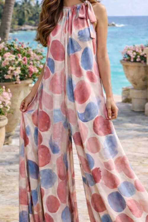 The off-the-shoulder asymmetrical neckline highlights the décolletage, while the open back with adjustable tie-back detail creates a striking yet feminine silhouette. A wide-leg design elongates the body, offering both comfort and elevated style — perfect for warm-weather events, destination getaways, weddings, or upscale evenings out.