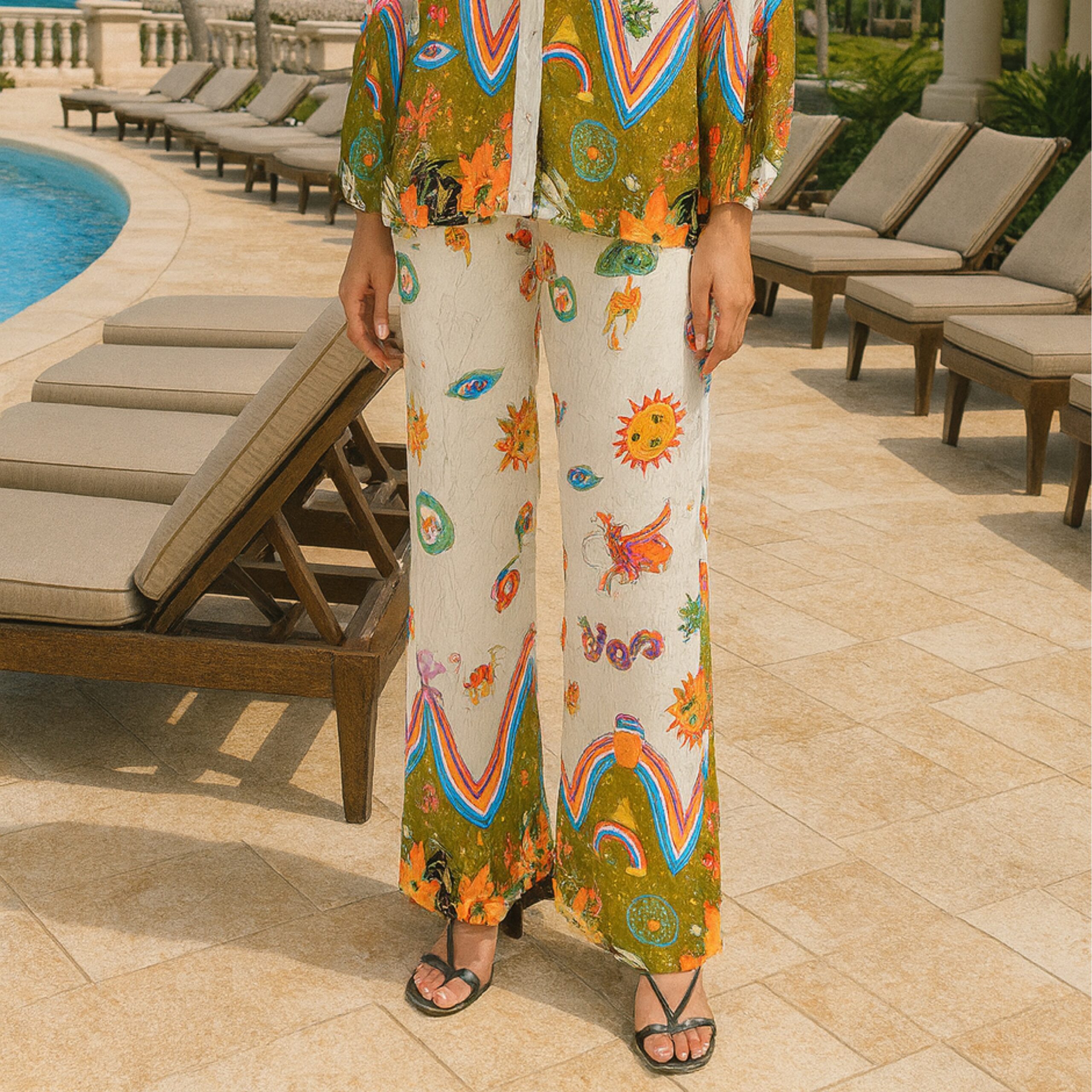 Wide-Leg Pant with Pockets and a Stretchy Waistband that Ties at the Front. Features a Tropical Toucan Print.