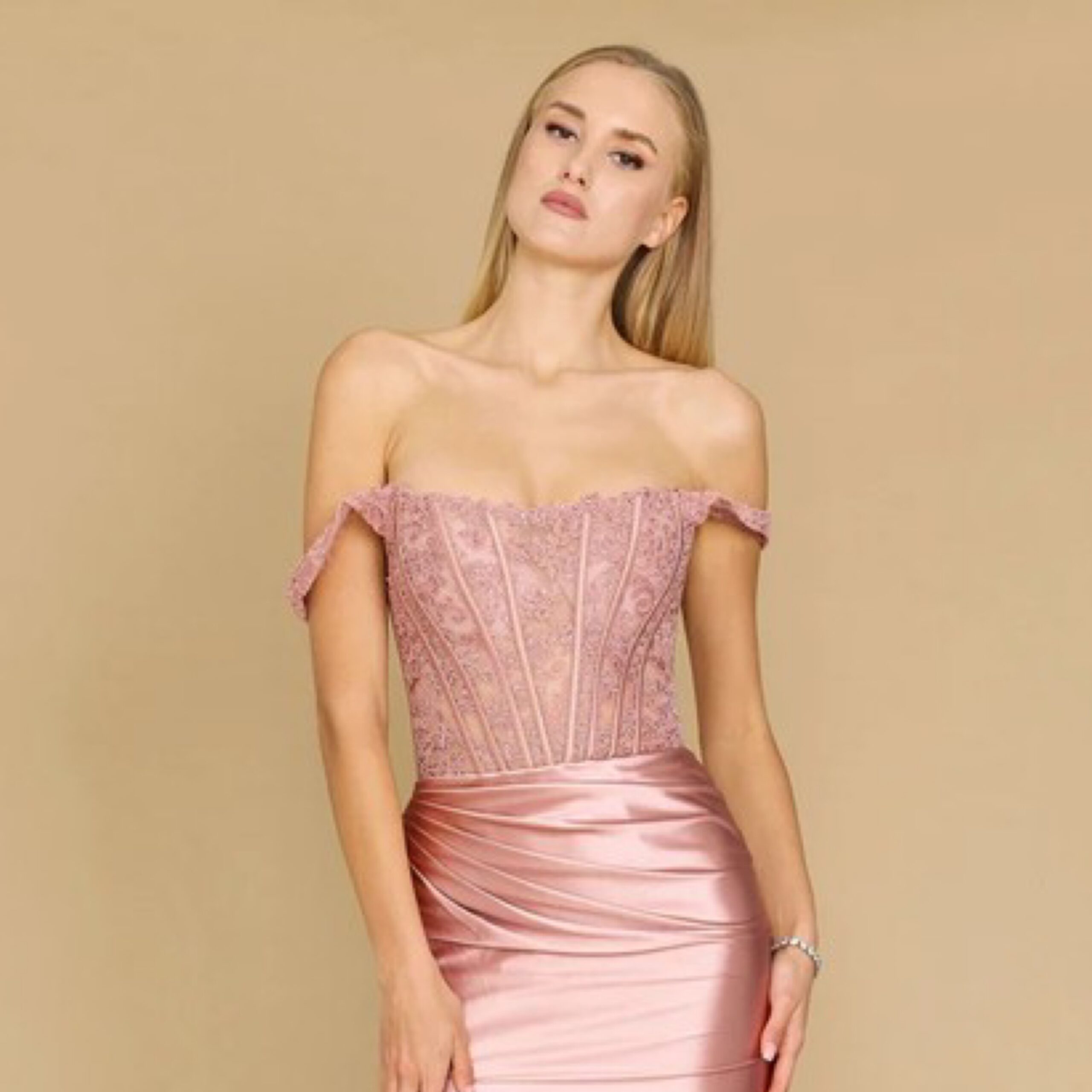 Its captivating silhouette is produced by the pleated accents, corset bodice, and off-shoulder style.