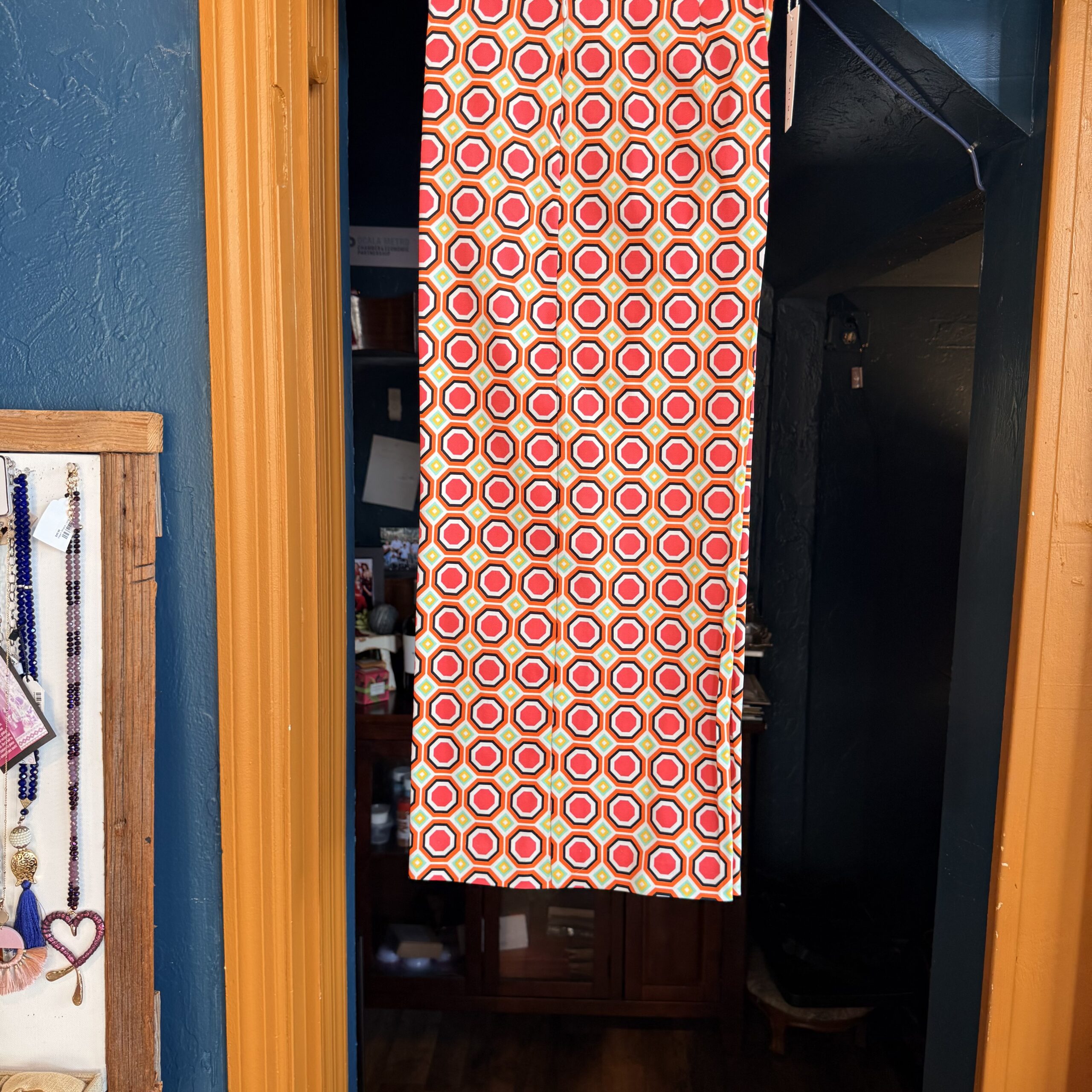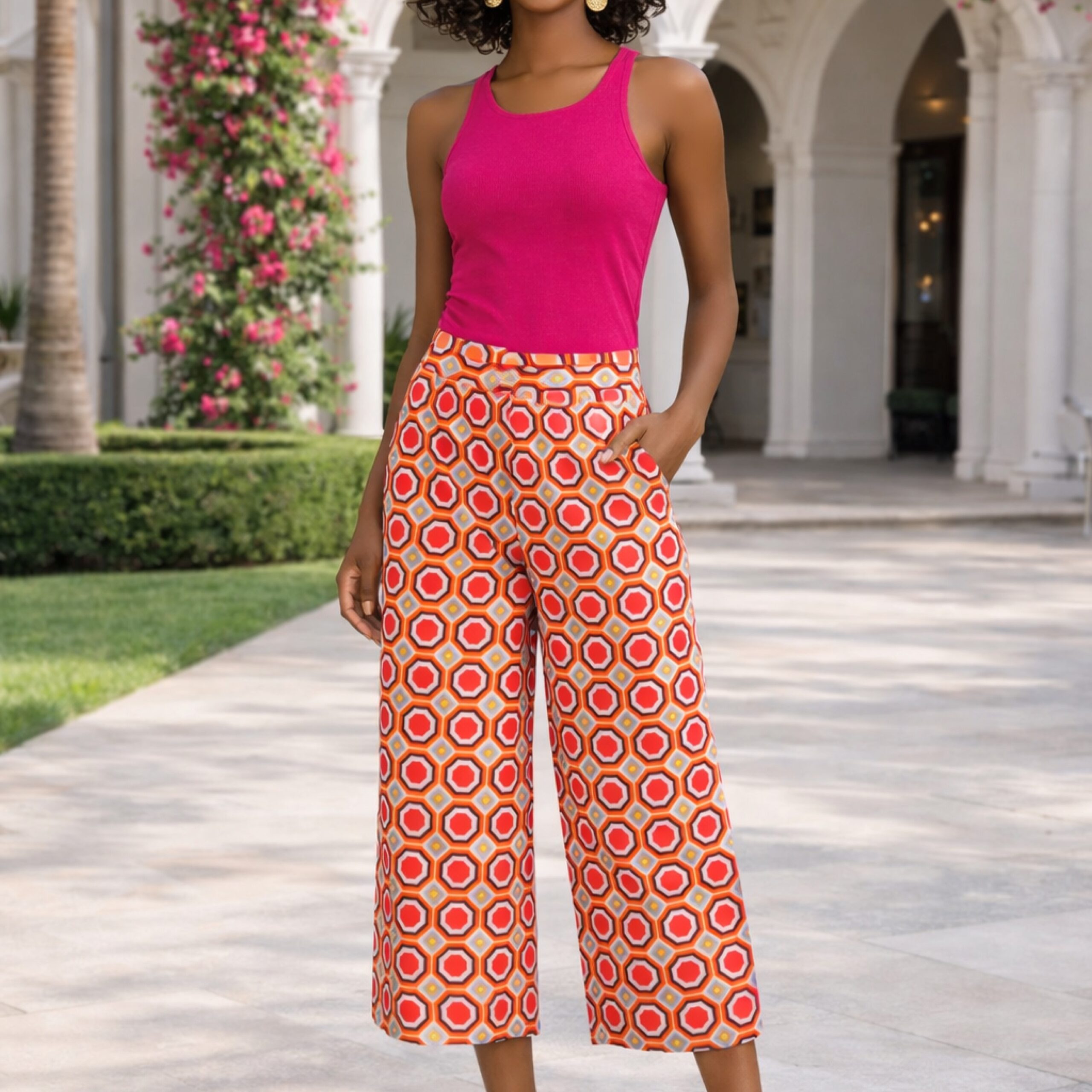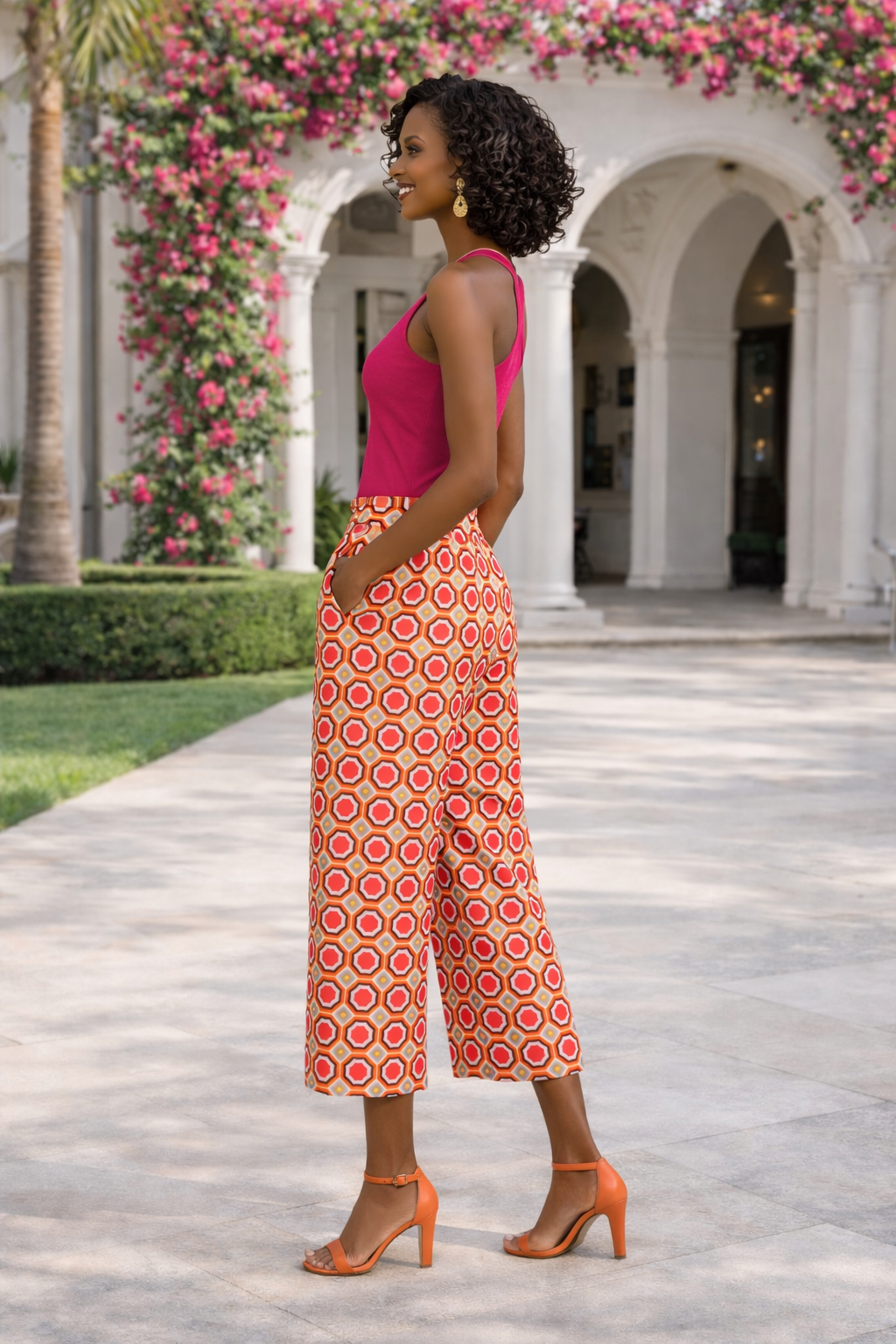 Turn heads in the Trina Turk Diona High-Rise Crop Pant, featuring a vibrant retro-inspired geometric print in coral, orange, pink, and white. Designed with a flattering high-rise waist and modern wide-leg cropped silhouette, this statement pant elongates the leg while offering effortless sophistication.
