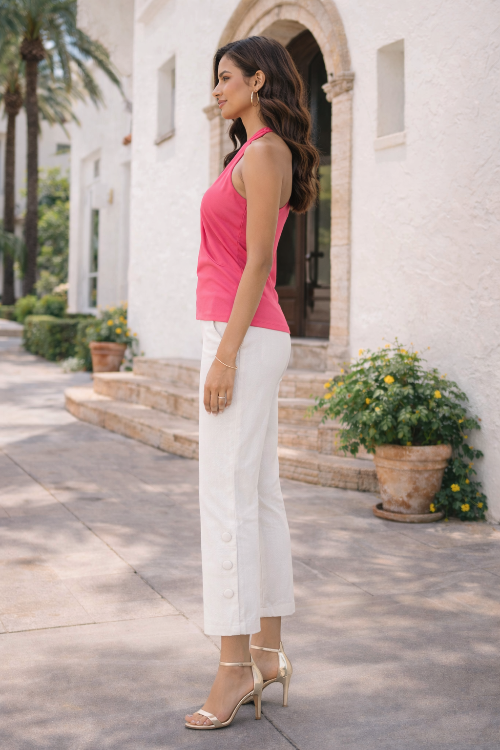 Elevate your warm-weather wardrobe with the Trina Turk Tortona White Crop Pants, a polished essential designed for effortless sophistication. These elegant white cropped trousers feature a modern straight-leg silhouette with statement side button detailing at the hem — the perfect blend of timeless and contemporary.